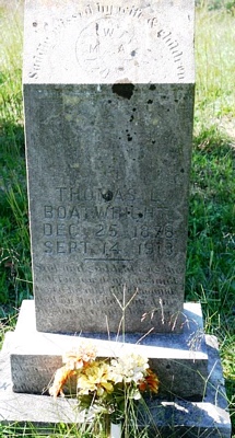 1900 Census: Name: Thomas Boatright Date: June 10, 1900 Home in 1900: Civil District 5, Dyer, TN. Age: 20 Estimated birth year: 1880 Birthplace: Tennessee Race: White Relationship to head-of-house: Brother Census Place: Civil District 5, Dyer, TN; Roll: T623 1568; Page: 9B; Enumeration District: 18. living with brother Correll 1910 Census: Name: Thomas A Boatwright Date: May 18, 1920 Age in 1910: 30 Estimated birth year: abt 1880 Birthplace: Tennessee Home in 1910: Civil District 17, Dyer, Tennessee Occupation: General Merchant Race: White Gender: Male Marital Status: Married Relation to Head of House: Head Mother's Birth Place: Tennessee Father's Birth Place: North Carolina Census Place: Civil District 17, Dyer, Tennessee; Roll: T624_1497; Page: 25B; Enumeration District: 32; Image: 1495. World War I Draft Registration Cards, 1917-1918 Name: Thomas Alfred Boatright City: Dyersburg County: Dyer State: Tennessee Birth Date: 5 Jul 1877 Race: White Roll: 1852980 DraftBoard: 0 Height: Tall Build: Slender Eyes: Light Brown Hair: Black 1920 Census: Name: T A Boatright January 19, 1920 Age: 41 years Estimated birth year: abt 1879 Birthplace: Tennessee Race: White Home in 1920: Newport, Attala, Mississippi Occupation: Farmer Sex: Male Marital status: Married Relation to Head of House: Head Able to read: Yes Able to Write: Yes Mother's Birth Place: Tennessee Father's Birth Place: North Carolina Census Place: Newport, Attala, Mississippi; Roll: T625_869; Page: 14A; Enumeration District: 9; Image: 889.Burial: Mispah Cemetery, Durant, Holmes County, Mississippi